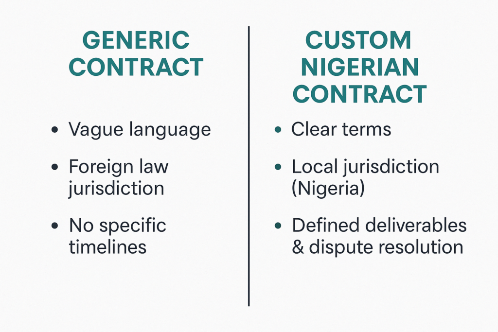 Right side: “Custom Nigerian Contract” (clear terms, local jurisdiction, enforceable)